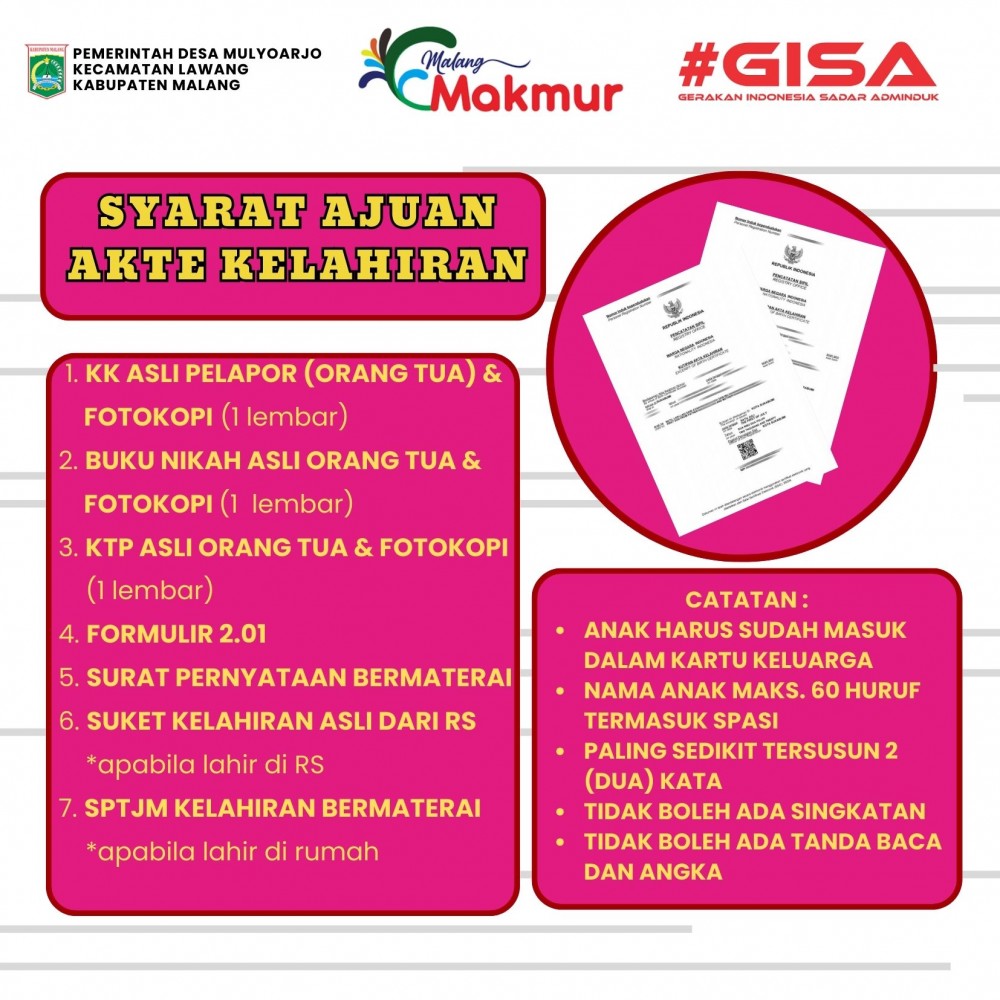 Pengajuan Administrasi Kependudukan dapat diajukan di Kantor Desa Mulyoarjo (DESAKU TUNTAS). Program yang dicanangkan oleh DISPENDUKCAPIL KABUPATEN MALANG bertujuan untuk memudahkan masyarakat desa dalam pengurusan admin… selengkapnya