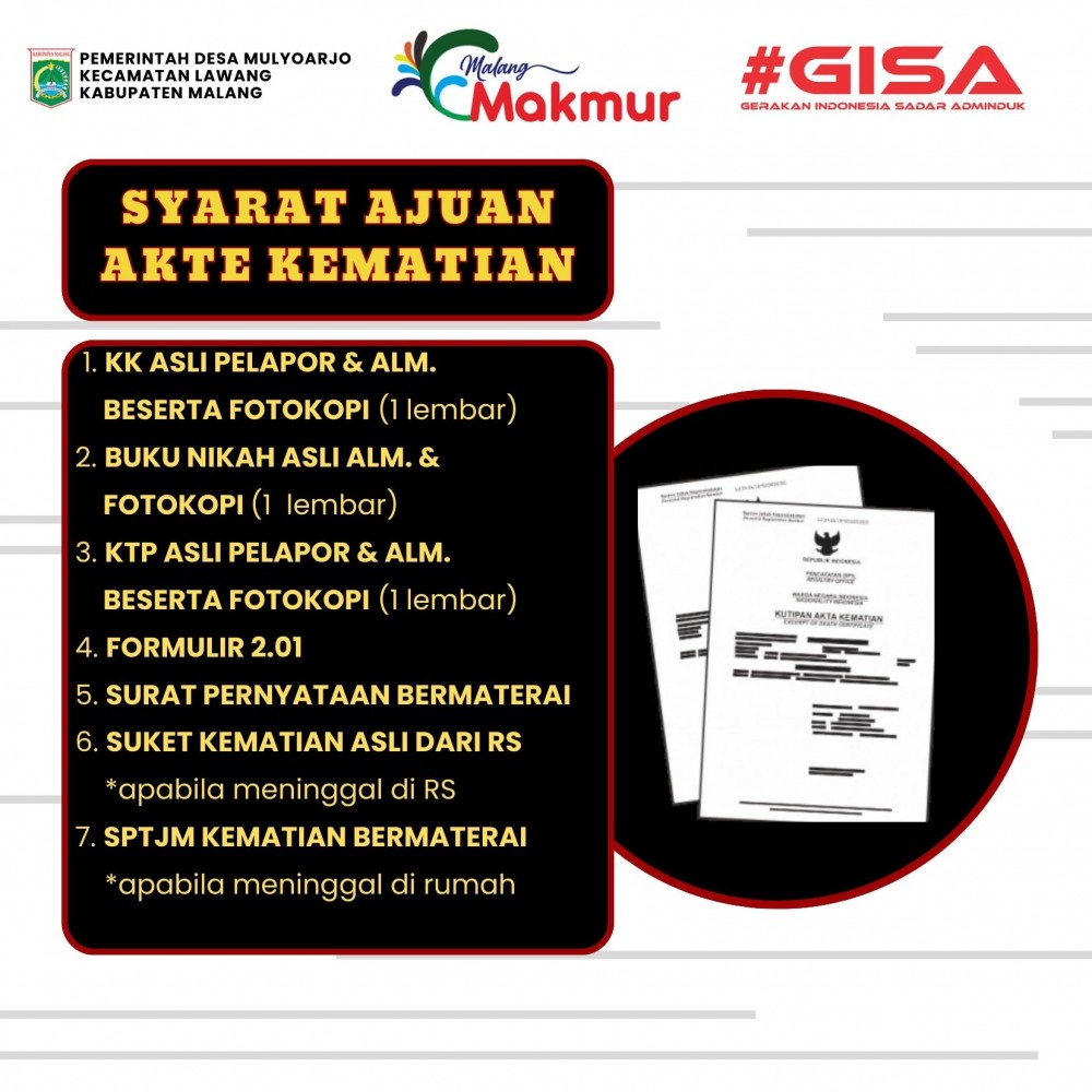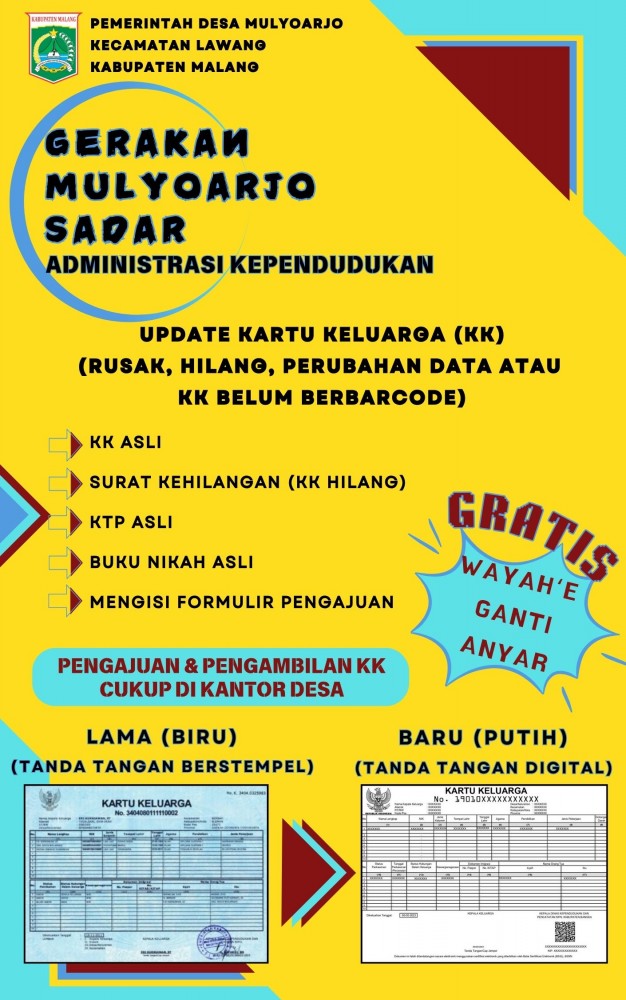 Pengajuan Administrasi Kependudukan dapat diajukan di Kantor Desa Mulyoarjo (DESAKU TUNTAS). Program yang dicanangkan oleh DISPENDUKCAPIL KABUPATEN MALANG bertujuan untuk memudahkan masyarakat desa dalam pengurusan administrasi kependudukan mulai dari Kartu Keluarga, Akta Kematian/Kelahiran, dan pengajuan KIA.